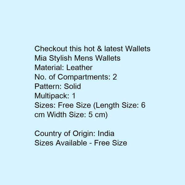 Checkout this hot & latest Wallets Mia Stylish Mens Wallets Material: Leather No. of Compartments: 2 Pattern: Solid Multipack: 1 Sizes: Free Size (Length Size: 6 cm Width Size: 5 cm) Country of Origin: India Sizes Available - Free Size